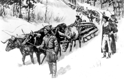 The problem, as you can imagine, lugging 59 cannon and mortars back to Boston. But in 56 days, Knox and the others did, moving the artillery 300 miles, using heavy sleds and teams of oxen, and arriving in Boston in January 1776.